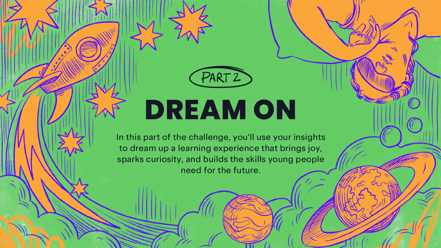 In this part of the challenge, learners will use their insights to dream up a learning experience that brings joy, sparks curiosity, and builds the skills young people need for the future.