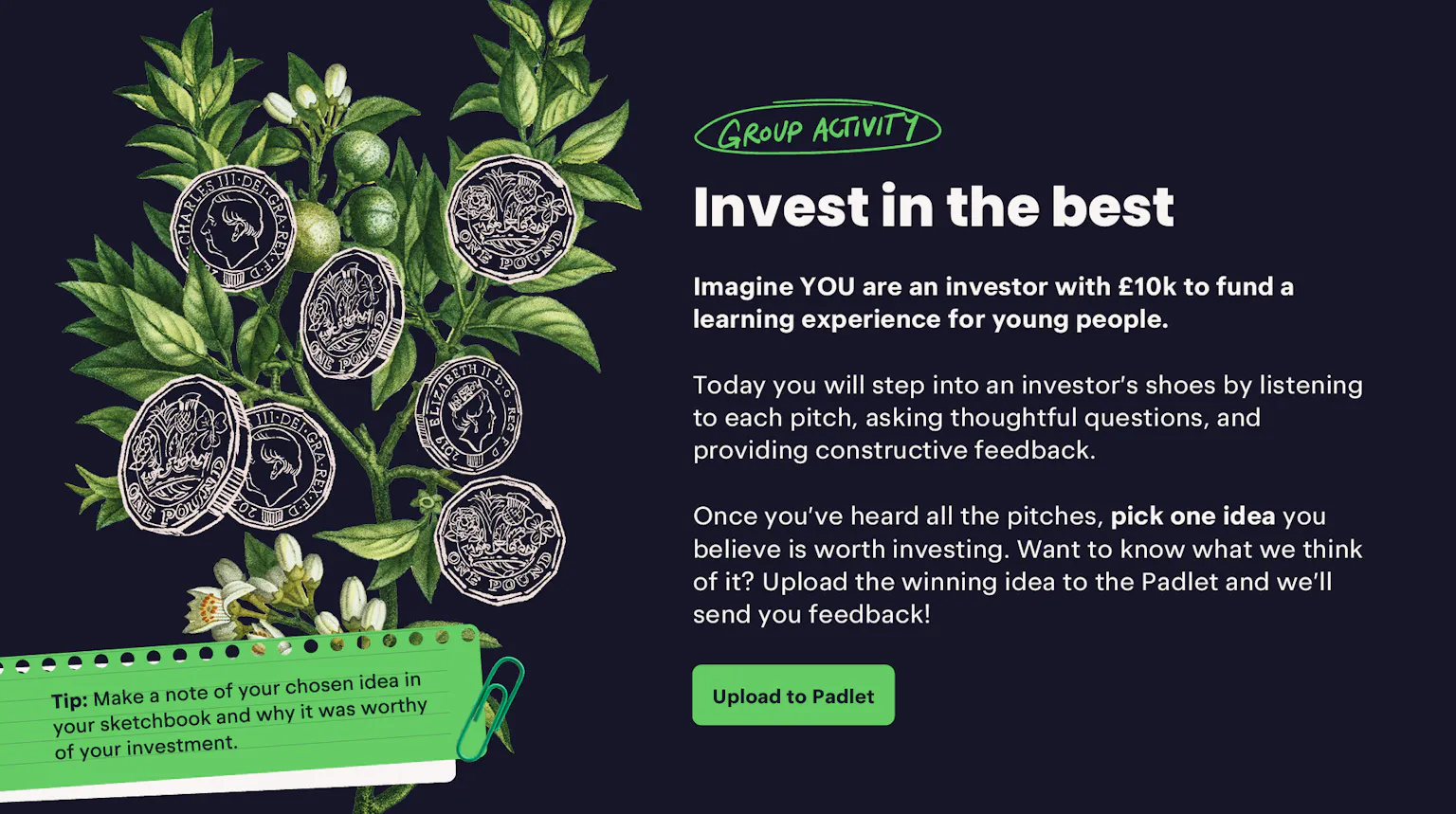 Learners will step into the role of investors by listening to each pitch, asking thoughtful questions, giving constructive feedback, and choosing one idea they believe is worth investing in.